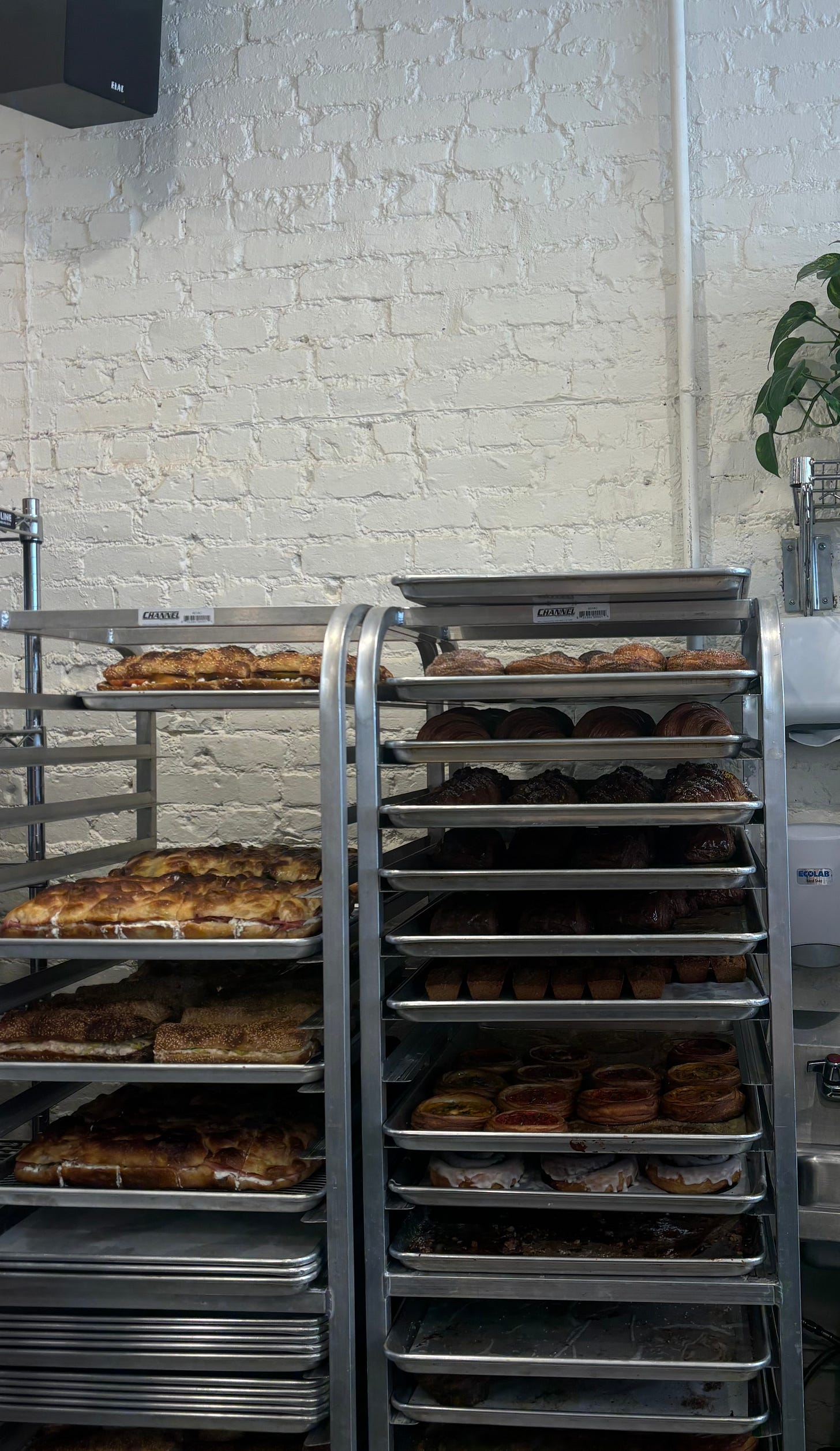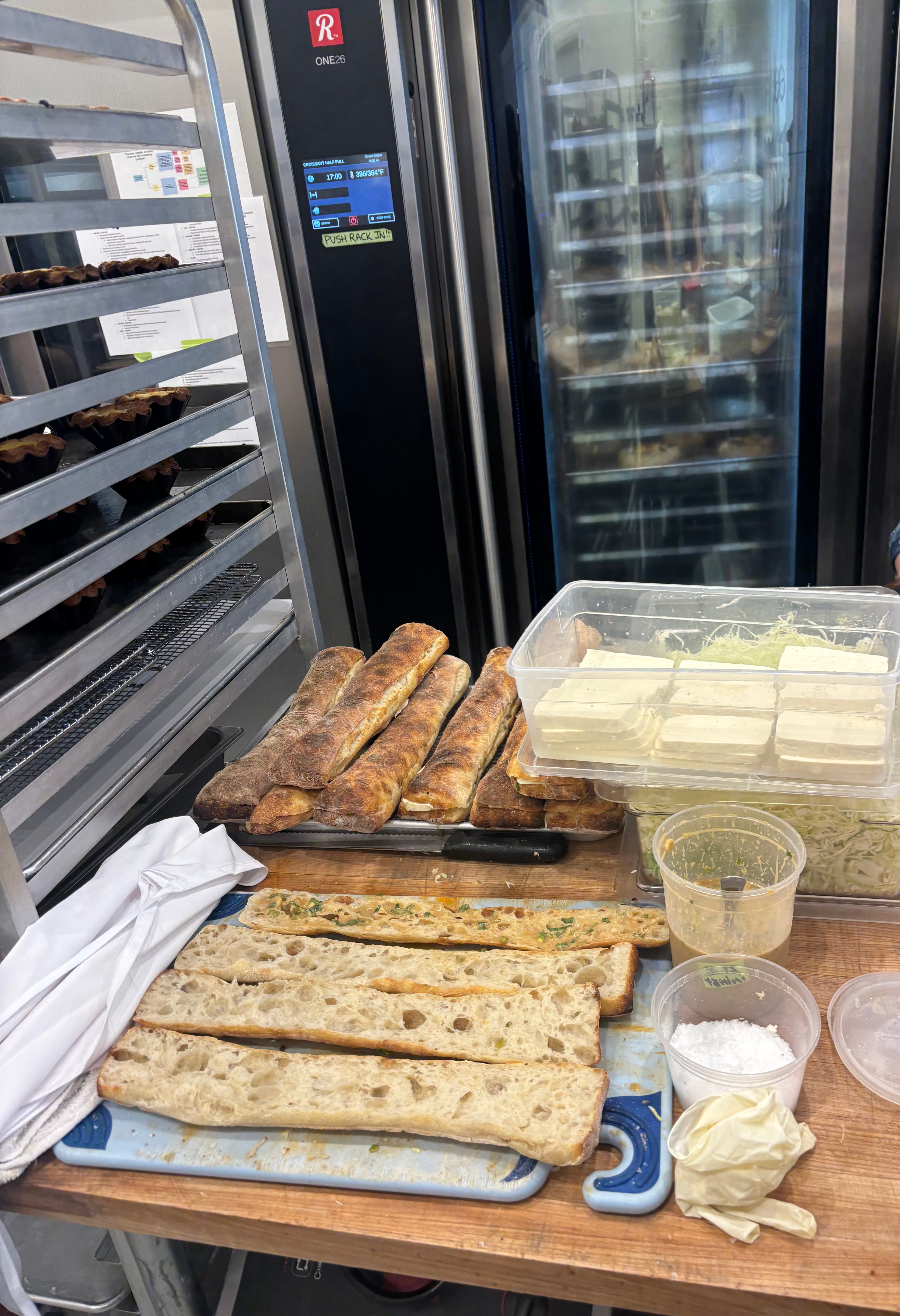The line stretched down the block, but inside it felt like a red carpet moment - straight passed the crowds and into the staff-only kitchen at Radio Bakery where stations moved in perfect rhythm: croissants sliced open for sandwiches, focaccia slathered with aioli and coleslaw, trays pulled hot from the oven and stacked with golden pastries before finding their place in the glass case with perfect choreography.