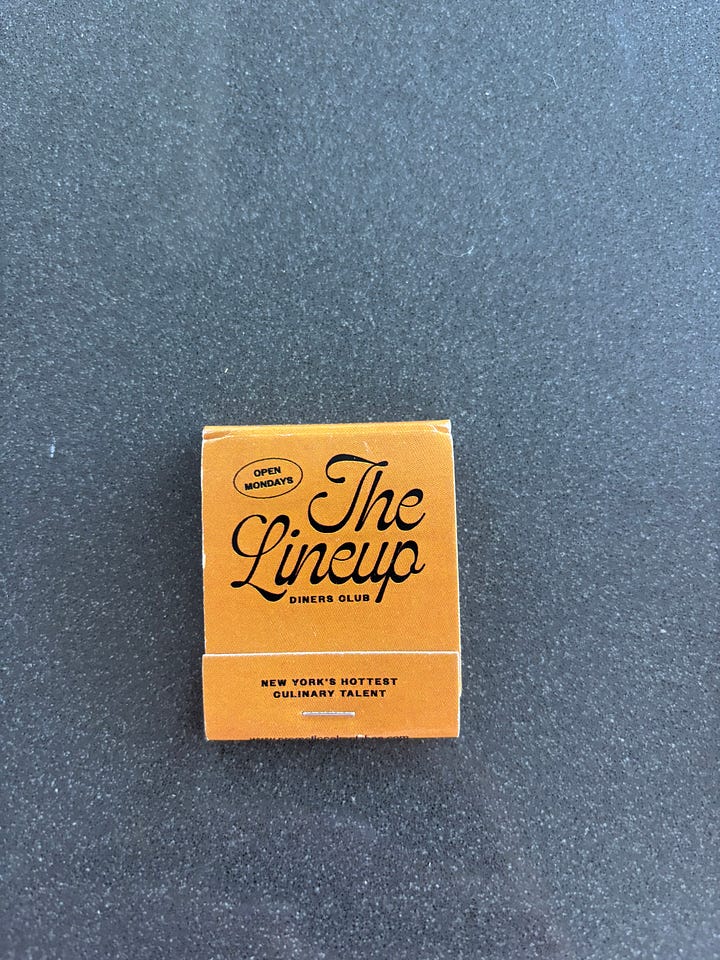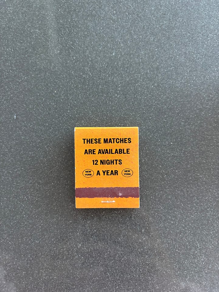 This matchbook from ELENA ROSE BESSER’s the Lineup Slice Shop in 2024, which were seemingly repurposed from previous seasons of her Lineup Dinner Club, has a perfect vintage color, lived in creases, and a bit of FOMO with the 12-nights a year copy. It happens to be one of my favorites.