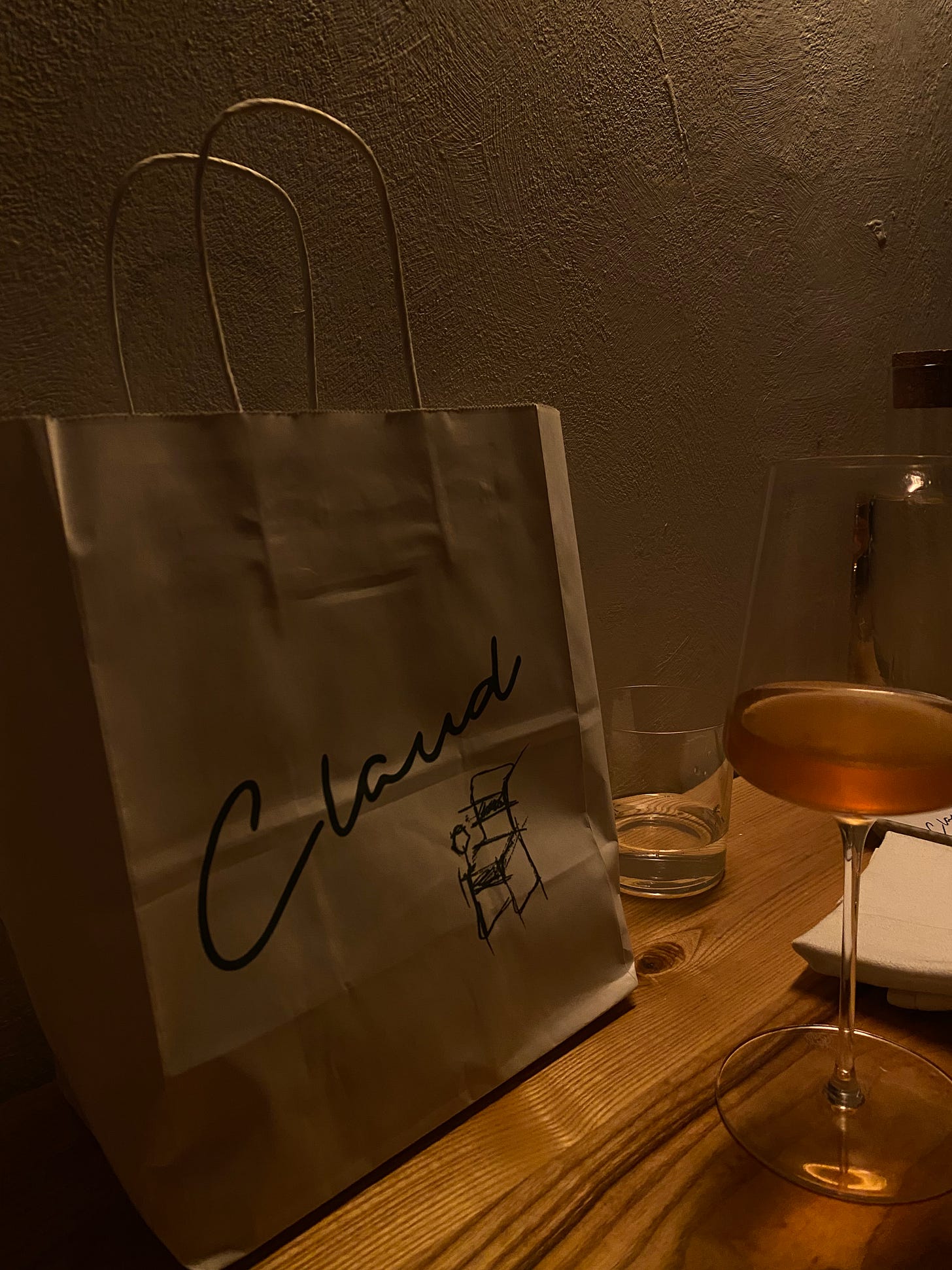 The doggy bag you grab on your way out — which maybe you don’t keep permanently but it helps to savor the meal just a few days longer. Like this one from Claud, after a meal a few years ago where we celebrated my best friends’ birthday, and she got to take what remained of their massive slice of chocolate cake to go.