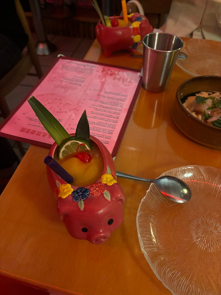 Tâm Tâm in Miami has equally covetable drink ware - a high-low mix of beautiful logo’d wine glasses that I can picture sipping a cold orange from on the couch, and a pig-shaped cocktail barrel that would probably only make an appearance a few times a year at home.