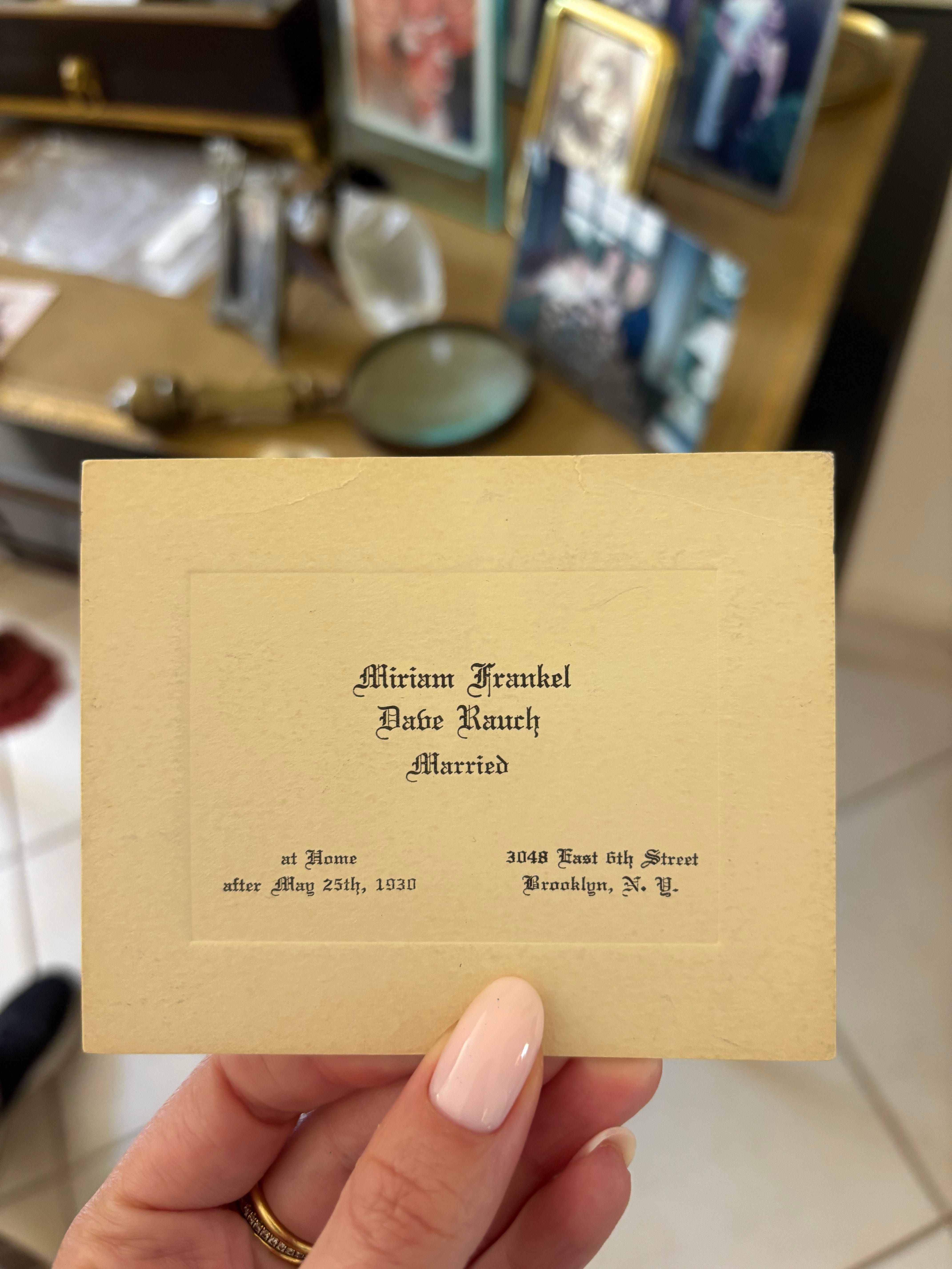 A wedding invitation from her parents (my great-grandparents) hosted in their home in Brighton Beach, Brooklyn in 1930. I didn’t even know our family had lived there. Now, almost 100 years later, I live in Brooklyn too.