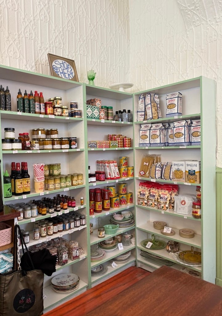 At Salty Lunch Lady Luncheonette in Ridgewood, there’s a small section of kitchen-goods for sale - hot sauces, condiments, Maldon salts. The plates are there too, as if they’re part of it, but they aren’t actually for sale sadly. I would have taken one of the quirky, dainty flower plates immediately.