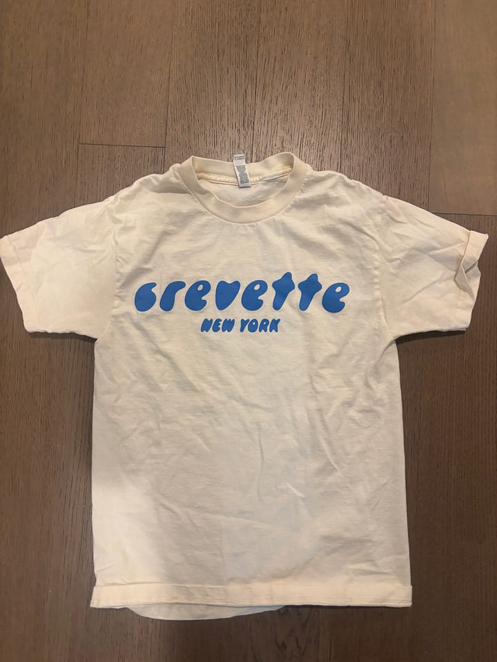 Some restaurants sell mugs, t-shirts, hats - little pieces of themselves you buy and bring home. During my third meal at Crevette, I noticed that all of the staff were wearing these perfectly creme colored t-shirts that were the perfect thick cut tee, and my coworker and I knew we immediately had to go home with matching ones. It’s one of my favorite t-shirts.