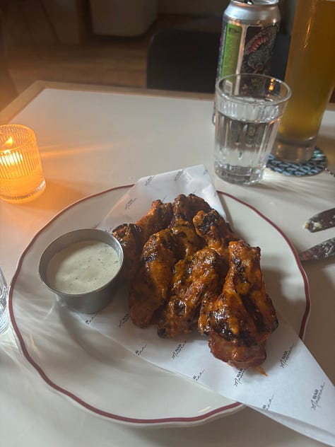 Bar Madonna comes from former Carbone manager Ray Rando, and while he brings a touch of Italian inspiration, he leaves behind just about everything else. The menu is Italian‑ish, American‑ish, with a strong dose of after‑school munchies energy. Think bar food, but sharper and way more fun. The Caesar is a grilled baby romaine with smoked‑Caesar dressing, the wings are grilled Calabrese‑style with pickled Calabrian hot sauce, and the “burger” is a smashed meatball parm on a sesame‑seed semolina bun.